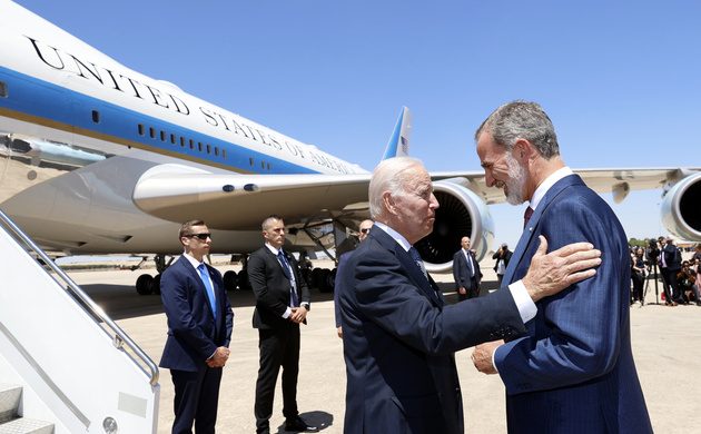 El Rey de España, acompañado del Ministro de Asuntos Exteriores, José Manuel Albares y la ministra de Defensa, Margarita Robles, recibió en la Base Aérea de Torrejón al Presidente de los Estados Unidos de América, Joseph R. Biden Jr. que viaja por primera vez a España para asistir a los actos de la 32ª Cumbre de la OTAN.