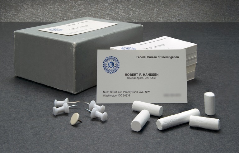 Las tarjetas de presentación de Robert Hanssen y la tiza y las chinchetas que usó para dejar mensajes a sus contactos mientras espiaba para Rusia (Foto: FBI)
