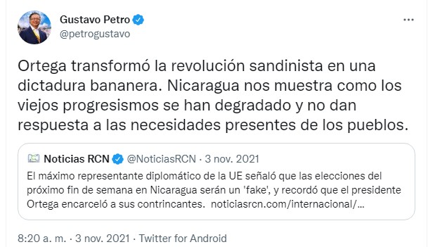En noviembre de 2021 el ahora presidente de Colombia, Gustavo Petro, había dicho que no reconocería la reelección presidencial de Daniel Ortega en Nicaragua, por la falta de democracia y la feroz persecución y encarcelamiento de los candidatos opositores