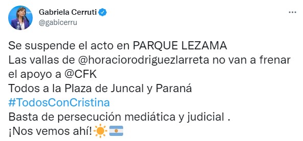 Gabriela Cerruti, dijo este sábado “Se suspende el acto en Parque Lezama. Las vallas de Horacio Rodríguez Larreta no van a frenar el apoyo a Cristina Kirchner. Todos a la plaza de Juncal y Paraná. Todos con Cristina. Basta de persecución mediática y judicial. ¡Nos vemos ahí!”.