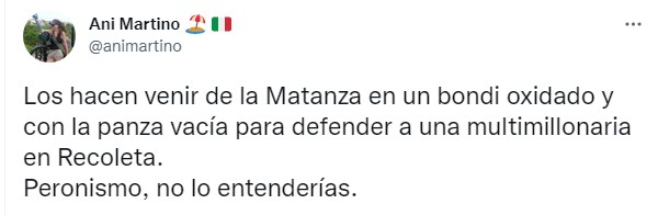 Por su parte, la diputada opositora al gobierno kirchnerista y Presidente de la Coalición Cívica-ARI de la Ciudad de Buenos Aires, Paula Oliveto, expresó: “Los argentinos queremos vivir en paz y sin violencia. Da pena que marchen a Recoleta a defender a una mujer millonaria que es investigada en la justicia y callan ante el ajuste, tarifazo e inflación”.