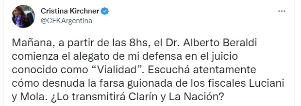 Ante esto, la acusada escribió un tuit este domingo: “Mañana, a partir de las 8hs, el Dr. Alberto Beraldi comienza el alegato de mi defensa en el juicio conocido como “Vialidad”. Escuchá atentamente cómo desnuda la farsa guionada de los fiscales Luciani y Mola. ¿Lo transmitirá Clarín y La Nación?”, preguntó.