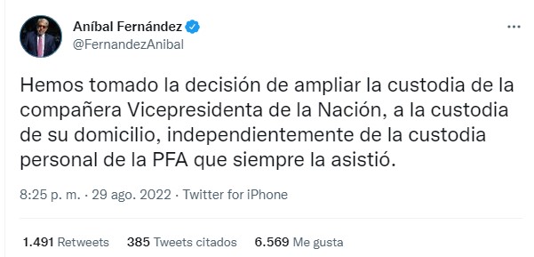 Ninguno de los miembros de su seguridad la rodea ni la cubre con su cuerpo ni se aplica el protocolo de protección. Algo que no se entiende ni puede justificarse, más aún si en prevención de lo que podría ocurrir, el ministro de Seguridad del gobierno kirchnerista, Aníbal Fernández, pocas horas antes había anunciado que “Hemos tomado la decisión de ampliar la custodia de la compañera Vicepresidenta de la Nación, a la custodia de su domicilio, independientemente de la custodia personal de la PFA [Policía Federal Argentina] que siempre la asistió”, publicó el ministro en Twitter.