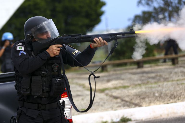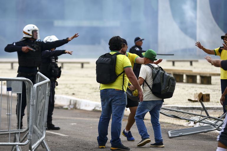 Las imágenes muestran que la policía militar que se encontraba en las inmediaciones del Congreso Nacional utilizó gas pimienta en un intento fallido de contener a los manifestantes que coreaban consignas golpistas.