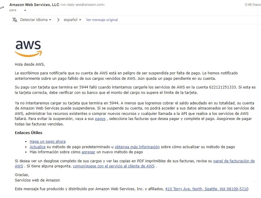 Un mensaje de una cuenta inexistente con datos falsos circula como enviado por Amazon Web Services LLC (AWS) y lo puede recibir cualquiera donde le reclaman el pago por un servicio que nunca se solicitó.