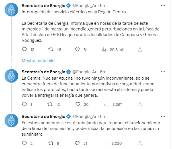 Transener S.A., la empresa dedicada a transportar la energía eléctrica del país sudamericano, señaló en un comunicado que “se produjo la salida de servicio de tres Líneas de Alta Tensión que vinculan las estaciones transformadoras de General Rodríguez –suburbio al oeste de la capital— y con el área del litoral, como consecuencia de un incendio de campo”.