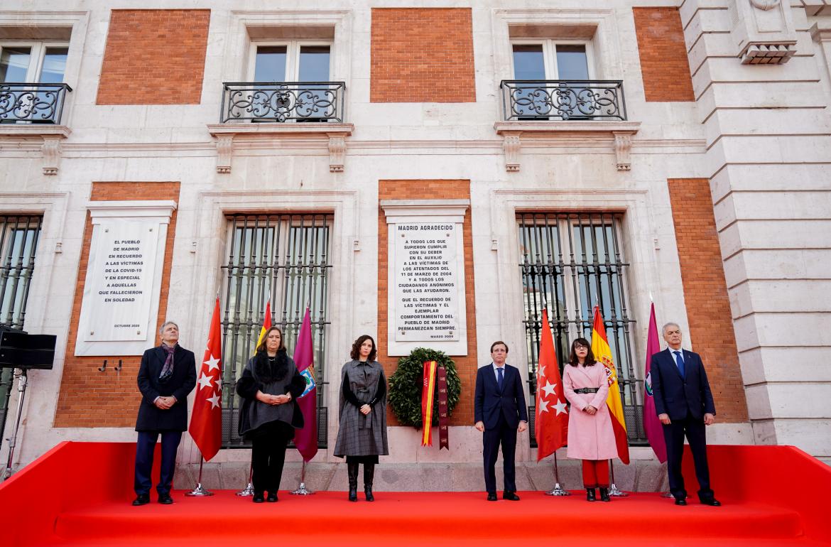 La presidenta de la Comunidad de Madrid, Isabel Díaz Ayuso, y el alcalde de Madrid, José Luis Martínez-Almeida, han depositado el sábado una corona de laurel ante la placa en la Real Casa de Correos que recuerda a las víctimas de los atentados del 11 de marzo de 2004 en Madrid, así como a los servicios de emergencias y ciudadanos que las auxiliaron, coincidiendo con el 19º aniversario. La corona luce las banderas de España, la Comunidad de Madrid y la ciudad de Madrid. Al inicio de la ceremonia, a las 10:00 horas, han tañido durante dos minutos las campanas del reloj de la sede de la Presidencia regional, junto con las de las iglesias de toda la Comunidad de Madrid.