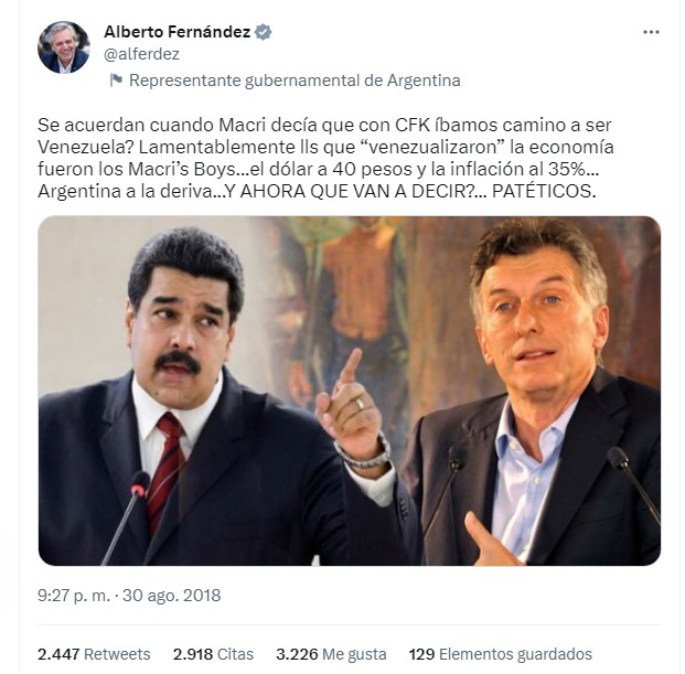 Lejos quedaron las críticas del hoy presidente de la Argentina, Alberto Fernández, que atacaba la suba del dólar en 2018, bajo el gobierno de Mauricio Macri y escribía en Twitter: “Se acuerdan cuando Macri decía que con CFK íbamos camino a ser Venezuela? Lamentablemente lls que “venezualizaron” la economía fueron los Macri’s Boys…el dólar a 40 pesos y la inflación al 35%… Argentina a la deriva…Y AHORA QUE VAN A DECIR?… PATÉTICOS”.