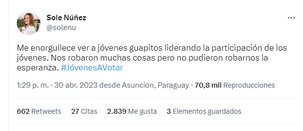 También empleó frases similares en una rueda de prensa cerca de las 14h. y reafirmó sus conceptos en su cuenta de Twitter: “Me enorgullece ver a jóvenes guapitos liderando la participación de los jóvenes. Nos robaron muchas cosas pero no pudieron robarnos la esperanza”.