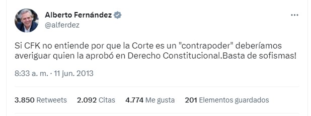 No recuerda el devaluado presidente, cuando años atrás, entonces enemigo de Cristina Fernández de Kirchner (CFK), escribía en Twitter que las decisiones de la Justicia se respetan: