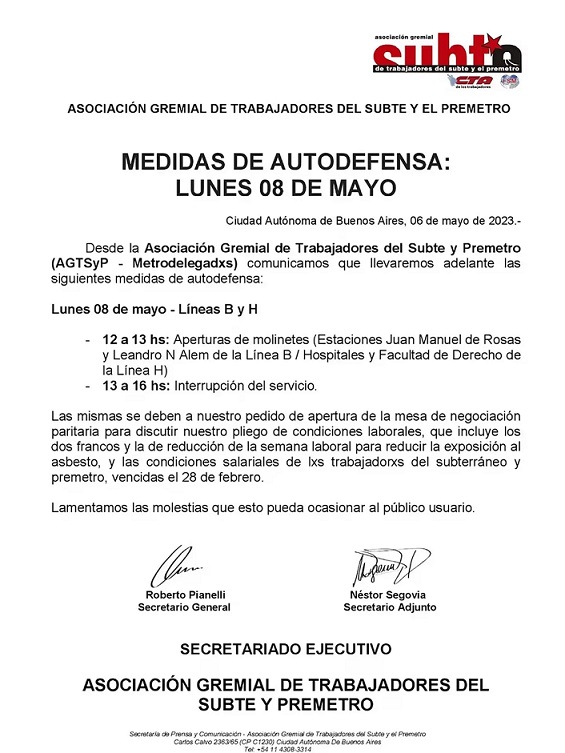 La Asociación Gremial de Trabajadores del Subte y Premetro (Agtsyp) de Buenos Aires, realizan este lunes (8) un paro de actividades en las líneas B y H entre las 13 y las 16 pidiendo “la reducción de la jornada laboral, el retiro del cancerígeno asbesto de la red y el cambio de las flotas contaminadas”, según informan en un comunicado.