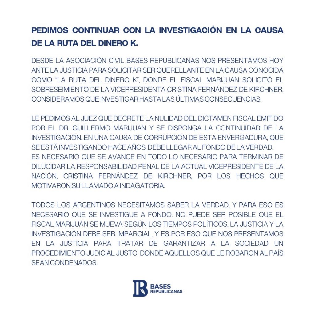 Entonces, este viernes, la  asociación Bases Republicanas hizo una presentación solicitando la nulidad del dictamen del fiscal Guillermo Marijuán quien pidió el sobreseimiento de la vicepresidenta.