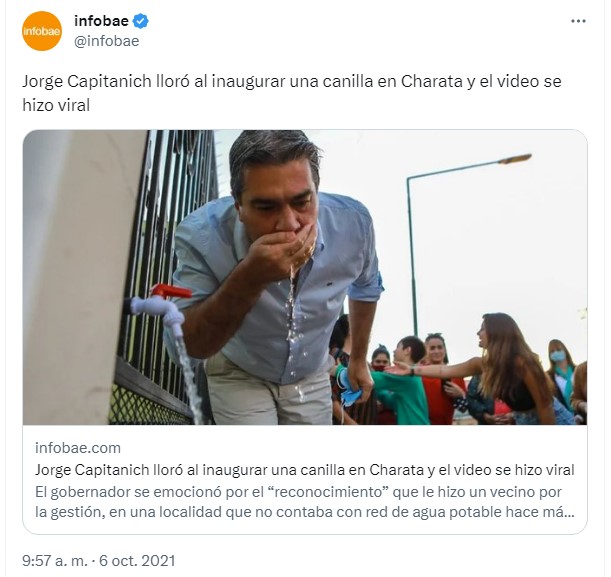 Ha llegado a la insólita actitud de llorar emocionado al inaugurar una única canilla de agua potable, en la calle de un pueblo de su provincia que carecía del vital líquido elemento para sus pobladores. Es una vergüenza que una ciudad del Chaco, solo tenga una canilla de plástico para darle agua a toda una población.