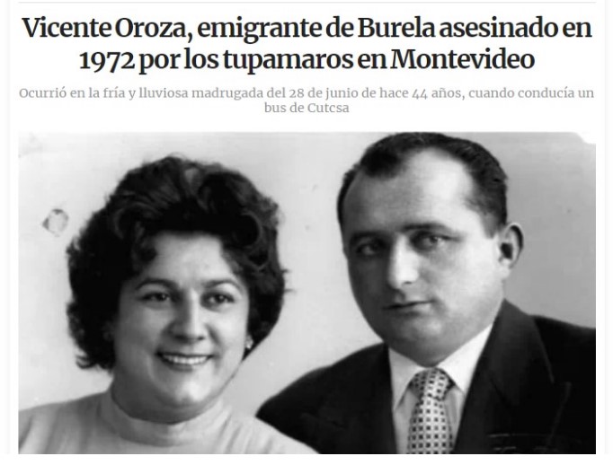 En una nota publicada en 2016, el periódico La Voz de Galicia, bajo el título: Vicente Oroza, emigrante de Burela asesinado en 1972 por los tupamaros en Montevideo, relataba que Vicente Oroza, chofer de la empresa de transporte público Cutcsa, asesinado por un tupamaro – plenamente identificado – en el Cerro de Montevideo, por negarse a atropellar con el ómnibus a un grupo de las fuerzas conjuntas que realizaba un control callejero, también en años de democracia. En el hecho los tupamaros hirieron a un soldado que subió al vehículo y Oroza intentó protegerlo y para ello les abrió la puerta trasera del autobus a los terroristas para que pudieran escapar, pero el tupamaro, que además era su vecino del barrio, asesinó a Oroza con varios balazos. (28 de junio de 1972). Hoy, su asesino cobra una pensión como ex preso político y conviene leer el tuit del hijo del chofer asesinado: