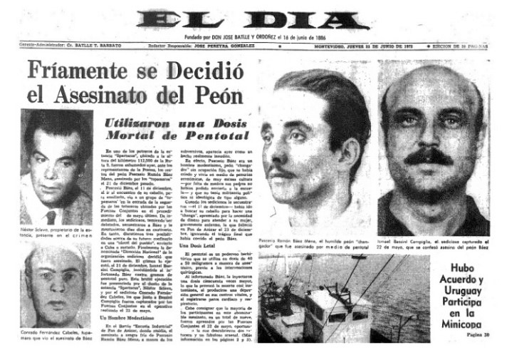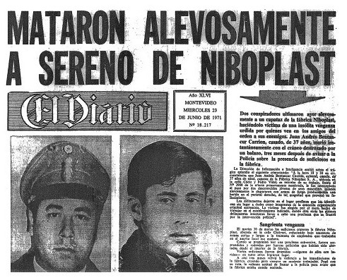 La ejecución por parte de los tupamaros de Juan Andrés Bentancur, sereno de la fábrica Niboplast, asesinado al dar aviso a la policía de que los tupamaros estaban robando en dicha empresa. – 22/06/71. Para la familia no hay resarcimiento, pero para alguno de sus atacantes si, que cobran pensiones del Estado.