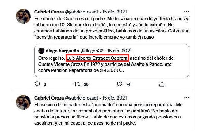 En una nota publicada en 2016, el periódico La Voz de Galicia, bajo el título: Vicente Oroza, emigrante de Burela asesinado en 1972 por los tupamaros en Montevideo, relataba que Vicente Oroza, chofer de la empresa de transporte público Cutcsa, asesinado por un tupamaro – plenamente identificado – en el Cerro de Montevideo, por negarse a atropellar con el ómnibus a un grupo de las fuerzas conjuntas que realizaba un control callejero, también en años de democracia. En el hecho los tupamaros hirieron a un soldado que subió al vehículo y Oroza intentó protegerlo y para ello les abrió la puerta trasera del autobus a los terroristas para que pudieran escapar, pero el tupamaro, que además era su vecino del barrio, asesinó a Oroza con varios balazos. (28 de junio de 1972). Hoy, su asesino cobra una pensión como ex preso político y conviene leer el tuit del hijo del chofer asesinado: