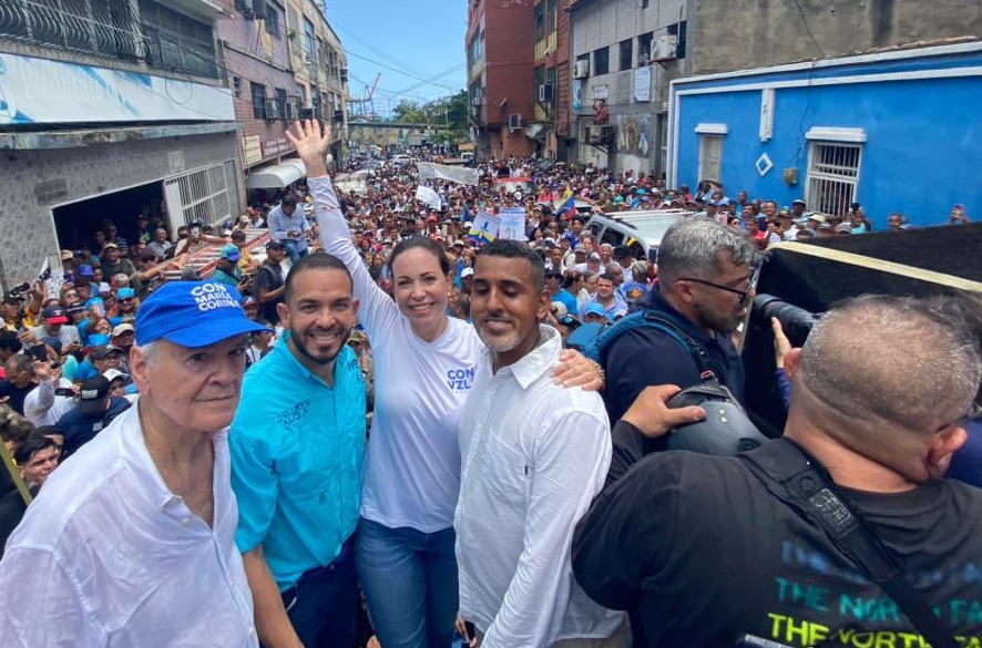 La líder opositora venezolana María Corina Machado, fue atacada por seguidores del gobierno chavista durante su recorrido por Petare en la mañana de este sábado 15 de julio.