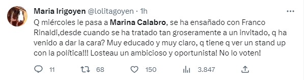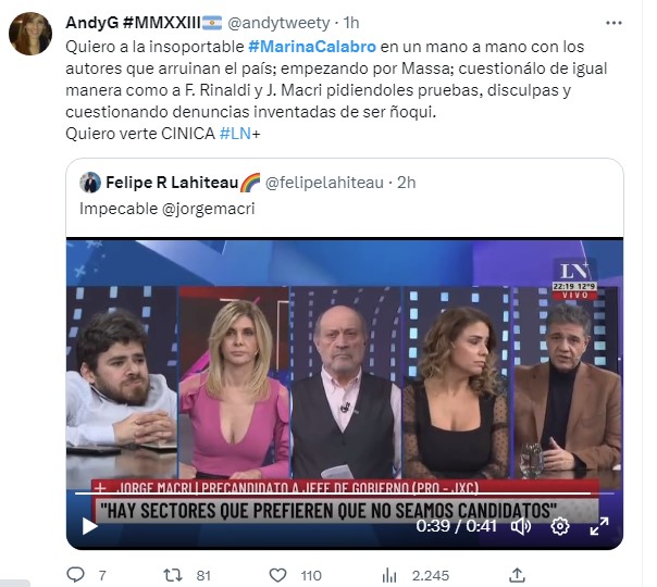 Junto a Leuco y Plager, se dedicó a intentar a acorralar a Jorge Macri y a Franco Rinaldi y los tres hicieron un triste papel. Me extraña en Leuco porque lo tenía en otro concepto. Plager vive en su mundo, mirando constantemente el monitor para ver como sale en cámara.