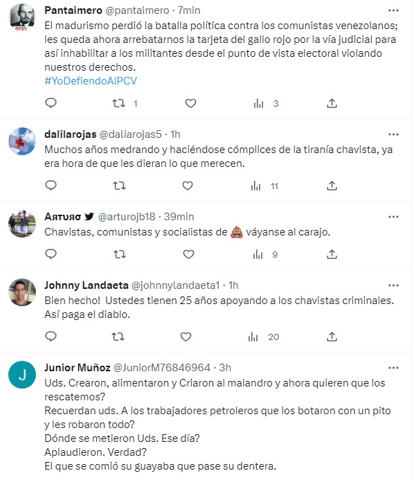 “Grupo de mercenarios al servicio del Gobierno-PSUV se prepara para solicitar -en las próximas horas- al Tribunal Supremo de Justicia (TSJ) la ilegal intervención del Partido Comunista de Venezuela”, escribió la directiva del PCV en twitter.