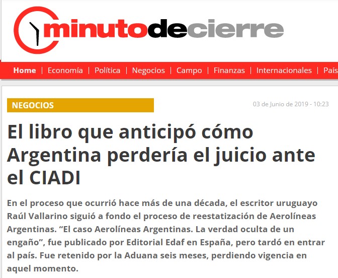 Le recomiendo a la vicepresidenta que lea el revelador libro sobre este hecho, escrito por el periodista uruguayo Raúl Vallarino, “El caso Aerolíneas Argentinas, la verdad oculta de un engaño”, un excelente trabajo de investigación que anticipó que el Estado argentino perdería el juicio ante el Centro Internacional de Arreglo de Diferencias (CIADI), una dura derrota que le costó al país millones de dólares.
