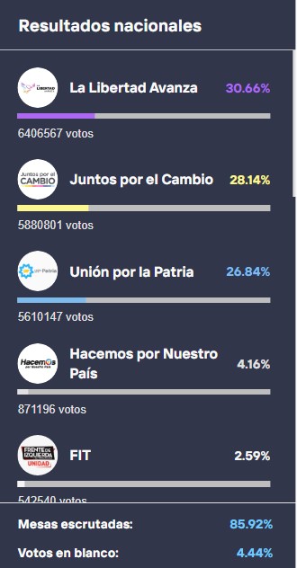 Según informes de TN, con el 85,92% de mesas escrutadas en todo el país, asi quedaron las posiciones: