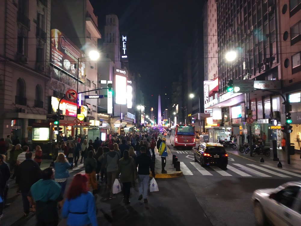 La eterna avenida Corrientes, convertida en horas de la noche en peatonal, muestra escenas donde nadie podría pensar que existe una crisis económica y hasta los teatros se benefician y se aprecian enormes filas de espectadores en espera para ingresar.