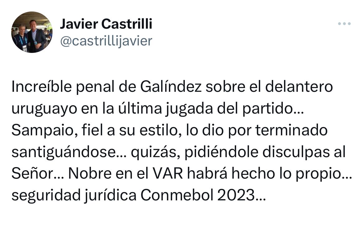 El exárbitro internacional argentino Javier Castrilli opinó al término del cotejo, opinó sobre la actuación de los brasileños Sampaio y (Daniel) Nobre en el VAR: “Increíble penal de Galíndez sobre el delantero uruguayo en la última jugada del partido… Sampaio, fiel a su estilo, lo dio por terminado santiguándose… quizás, pidiéndole disculpas al Señor… Nobre en el VAR habrá hecho lo propio…seguridad jurídica Conmebol 2023…”.