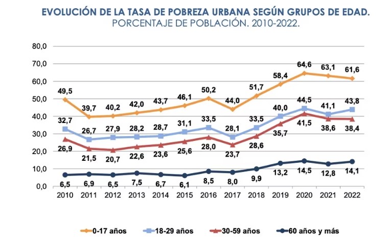 Revela que la tasa de pobreza es más alta en la franja etaria de cero a 17 años, en el 61,6%, un nivel que proyecta una muy elevado piso de pobreza para los próximos años.