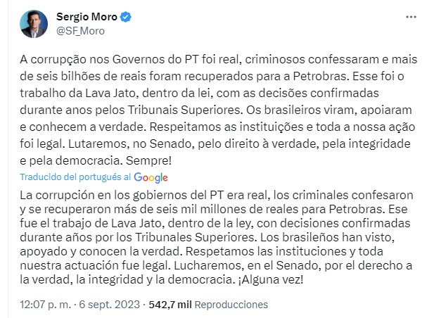 El ex juez y ahora senador Sérgio Moro, que condenó a Lula da Silva, rebate la decisión de la Justicia y manifiesta que “La corrupción en los gobiernos del PT (Partido de los Trabajadores) era real, los criminales confesaron y se recuperaron más de seis mil millones de reales para Petrobras. Ese fue el trabajo de Lava Jato, dentro de la ley, con decisiones confirmadas durante años por los Tribunales Superiores. Los brasileños han visto, apoyado y conocen la verdad. Respetamos las instituciones y toda nuestra actuación fue legal. Lucharemos, en el Senado, por el derecho a la verdad, la integridad y la democracia. Siempre!”.
