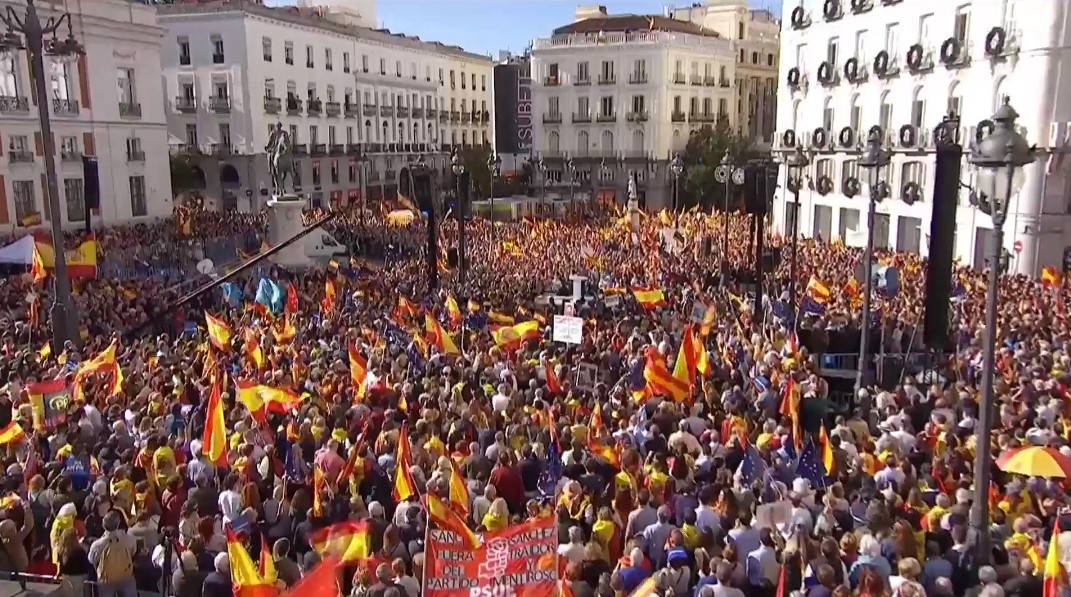 Este domingo en Madrid y en varias ciudades españolas, las movilizaciones de protesta han sido multitudinarias, para decir no a las intenciones del presidente en funciones, Pedro Sánchez, de otorgarles la amnistía a los independentistas catalanes que se levantaron en contra de la Constitución española.