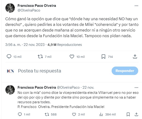 “Como ganó la opción que dice ‘donde hay una necesidad, no hay un derecho’, quiero pedirles a los votantes de Milei coherencia y por tanto que no se acerquen desde mañana al comedor, ni a ningún otro servicio que damos desde la Fundación Isla Maciel”, indicó en su cuenta de X (ex Twitter) el sacerdote, en relación con la organización que lo tiene como presidente y que encara acciones de trabajo comunitario en torno a la Parroquia Nuestra Señora de Fátima. “Tampoco pidan nada”, sostuvo Olveira.