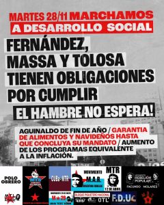 En la convocatoria de este martes, las exigencias al presidente Alberto Fernández, al ministro Sergio Massa y a la ministra de Desarrollo Social, Tolosa Paz, eran, “aguinaldo de fin de año, garantía de alimentos y navideños hasta que concluya su mandato y aumento de los programas equivalente a la inflación”.