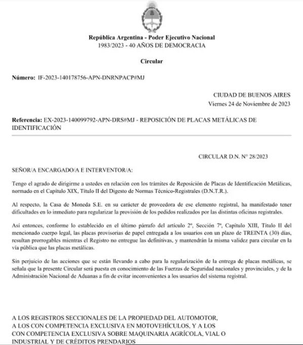 Ante la escasez de insumos, la Dirección Nacional de la Propiedad Automotor y la Casa de la Moneda implementaron que los vehículos circulen con el número de patente impreso en papel, en lugar de las placas metálicas