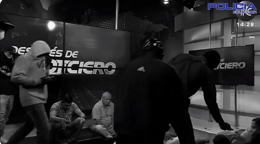 Más temprano el martes, previo al anuncio presidencial, un grupo de delincuentes irrumpió en un estudio del canal TC Televisión de la ciudad de Guayaquil, mientras transmitía en vivo un programa periodístico, y sometió a periodistas y colaboradores, a quienes colocaron explosivos en sus cuerpos y les exigieron entregar los micrófonos.