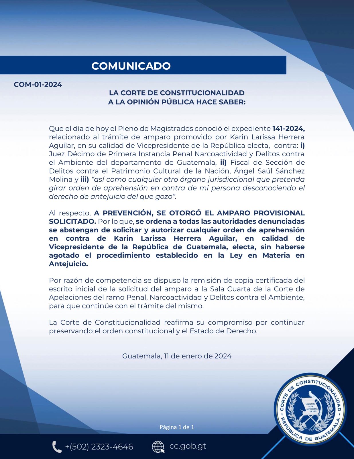 La Corte de Constitucionalidad de Guatemala a través de un comunicado, expresó que la vicepresidenta electa, Karin Herrera Aguilar, goza de inmunidad y no puede ser arrestada por ninguna autoridad.