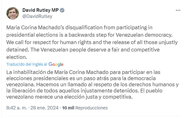 “La inhabilitación de María Corina Machado para participar en las elecciones presidenciales es un paso atrás para la democracia venezolana. Hacemos un llamado al respeto de los derechos humanos y la liberación de todos aquellos injustamente detenidos. El pueblo venezolano merece una elección justa y competitiva”, dice el mensaje británico.