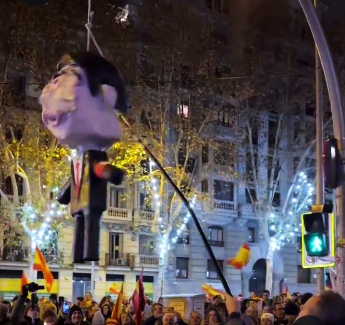 Como custodio de la “honorabilidad” del presidente socialista, Puente, rechaza que un muñeco que representa a Sánchez sea utilizado como piñata y golpeado en una manifestación de protesta frente a la sede del PSOE en Madrid, donde los opositores reclaman por la aministía que el gobierno le dará a los separatistas catalanes que atentaron contra la Constitución española.