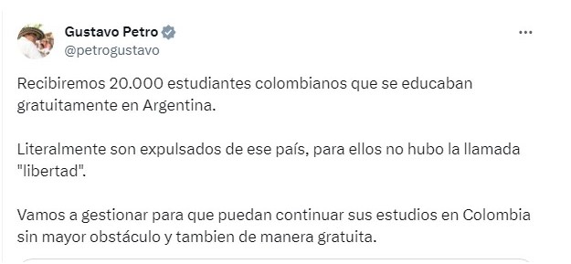 Pero Petro tergiversa la realidad cuando dice en la red social X (antes Twitter) que “Recibiremos 20.000 estudiantes colombianos que se educaban gratuitamente en Argentina. Literalmente son expulsados de ese país, para ellos no hubo la llamada “libertad”. Vamos a gestionar para que puedan continuar sus estudios en Colombia sin mayor obstáculo y tambien de manera gratuita”, pero no aclara que el artículo 553 del proyecto de ley de Argentina menciona que los extranjeros sin residencia deberán pagar por sus estudios en universidades públicas, un servicio al que actualmente acceden sin cargo y la pregunta es ¿Por qué no se hicieron residentes?