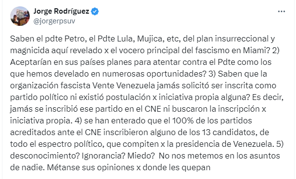 “Saben el pdte Petro, el Pdte Lula, Mujica, etc, del plan insurreccional y magnicida aquí revelado x el vocero principal del fascismo en Miami? 2) Aceptarían en sus países planes para atentar contra el Pdte como los que hemos develado en numerosas oportunidades? 3) Saben que la organización fascista Vente Venezuela jamás solicitó ser inscrita como partido político ni existió postulación x iniciativa propia alguna? Es decir, jamás se inscribió ese partido en el CNE ni buscaron la inscripción x iniciativa propia. 4) se han enterado que el 100% de los partidos acreditados ante el CNE inscribieron alguno de los 13 candidatos, de todo el espectro político, que compiten x la presidencia de Venezuela. 5) desconocimiento? Ignorancia? Miedo? No nos metemos en los asuntos de nadie. Métanse sus opiniones x donde les quepan”.