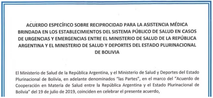 Según reveló INFOBAE, tanto la gestión de Evo Morales como la de Luis Arce se comprometieron ante el planteo del gobierno argentino a eliminar cualquier vestigio de discriminación o reticencia a brindarle atención a los argentinos que necesiten asistencia médica en el país vecino. “Las partes realizarán una difusión constante y permanente del acuerdo de 2019 y del presente, a fin de asegurar el adecuado conocimiento de sus disposiciones, alcance y obligaciones para asegurar su efectivo cumplimiento”, indica el artículo 5 del documento.