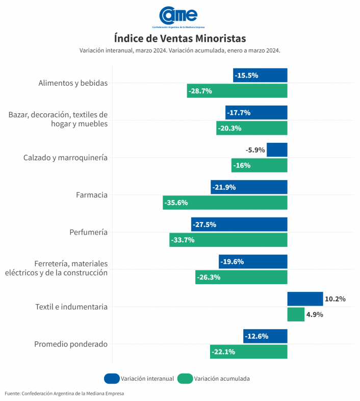Así surge del Índice de Ventas Minoristas Pymes de la Confederación Argentina de la en Mediana Empresa (CAME), elaborado en base a un relevamiento mensual entre 1.350 comercios minoristas del país, realizado del 3 y 5 de abril.