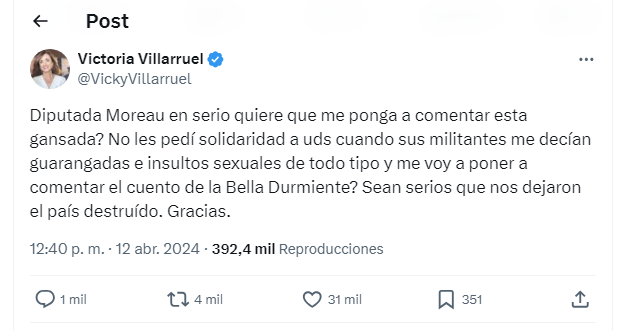 La vicemandataria le respondió con buen tino: “Diputada Moreau en serio quiere que me ponga a comentar esta gansada? No les pedí solidaridad a ustedes cuando sus militantes me decían guarangadas e insultos sexuales de todo tipo y me voy a poner a comentar el cuento de la Bella Durmiente? Sean serios que nos dejaron el país destruído. Gracias”, y dio por terminado el asunto.