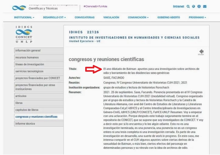 Manuel Adorni, el vocero del presidente Milei, al referirse a los despidos en el CONICET, explicó:  “El Presidente (Milei) entiende la importancia de la ciencia, valora los hallazgos que permiten mejoras concretas en la sociedad y, de hecho, se está construyendo un CONICET que pone sus esfuerzos en el desarrollo de la bioeconomía o en la inteligencia artificial aplicada a la medicina. Y no en uno que gasta su tiempo en investigaciones de dudosa utilidad, como aquel que, por ejemplo, abordaba la orientación sexual de Batman. Como resultado, a pesar de que en 20 años se ha triplicado la cantidad de investigadores en el Conicet, Argentina está sexto en el ranking de innovación en América Latina, por detrás de Brasil, Chile, México, Colombia y Uruguay”, dijo el portavoz.