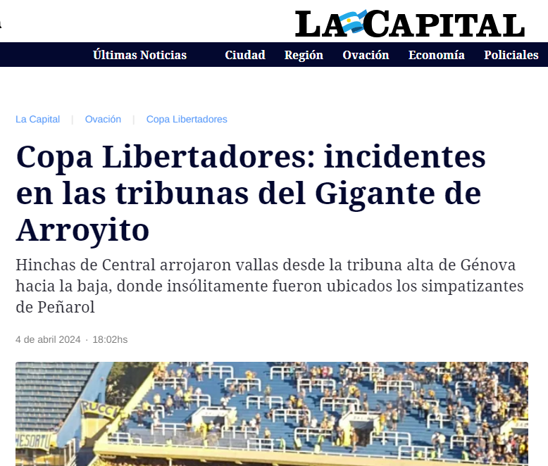 El periódico rosarino informa en titulares: “Copa Libertadores: incidentes en las tribunas del Gigante de Arroyito” y debajo menciona la insólita medida de los dirigentes argentinos; “Hinchas de Central arrojaron vallas desde la tribuna alta de Génova hacia la baja, donde insólitamente fueron ubicados los simpatizantes de Peñarol”