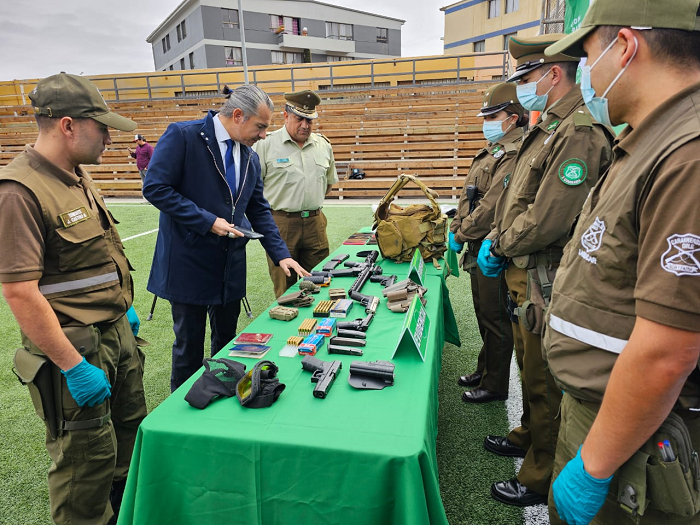El grupo fue detenido durante un amplio operativo desarrollado por Carabineros en la madrugada de este lunes en el campamento Cerro Bonito, ubicado en el sector centro alto de la ciudad. Durante el operativo, se incautaron 2,5 kilos de Ketamina, armas de fuego, una gran cantidad de municiones, explosivos mineros y dos granadas de guerra, entre otros elementos.