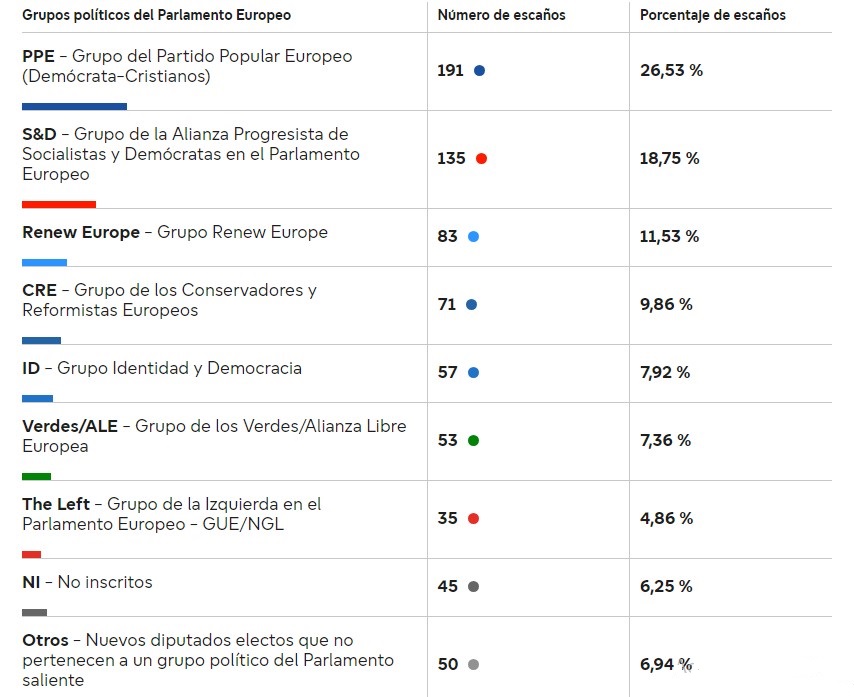 Los primeros resultados oficiales de las elecciones al Parlamento Europeo confirman que el derechista Partido Popular Europeo (PPE), que apoya a la actual presidenta de la Comisión Europea, Ursula von der Leyen, lidera y obtiene 191 de los 720 escaños.