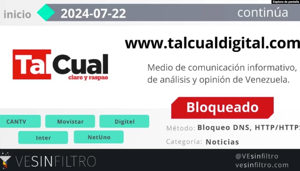 “A partir de mediodía de este lunes, el gobierno impuso a las operadoras Cantv, Digitel, Movistar, NetUno e Inter bloquear nuestro sitio web. Este equipo de periodistas continuará trabajando para informar a una sociedad que sufre el impacto de un sistema que restringe sus libertades”, afirmó Tal Cual en la red social X.