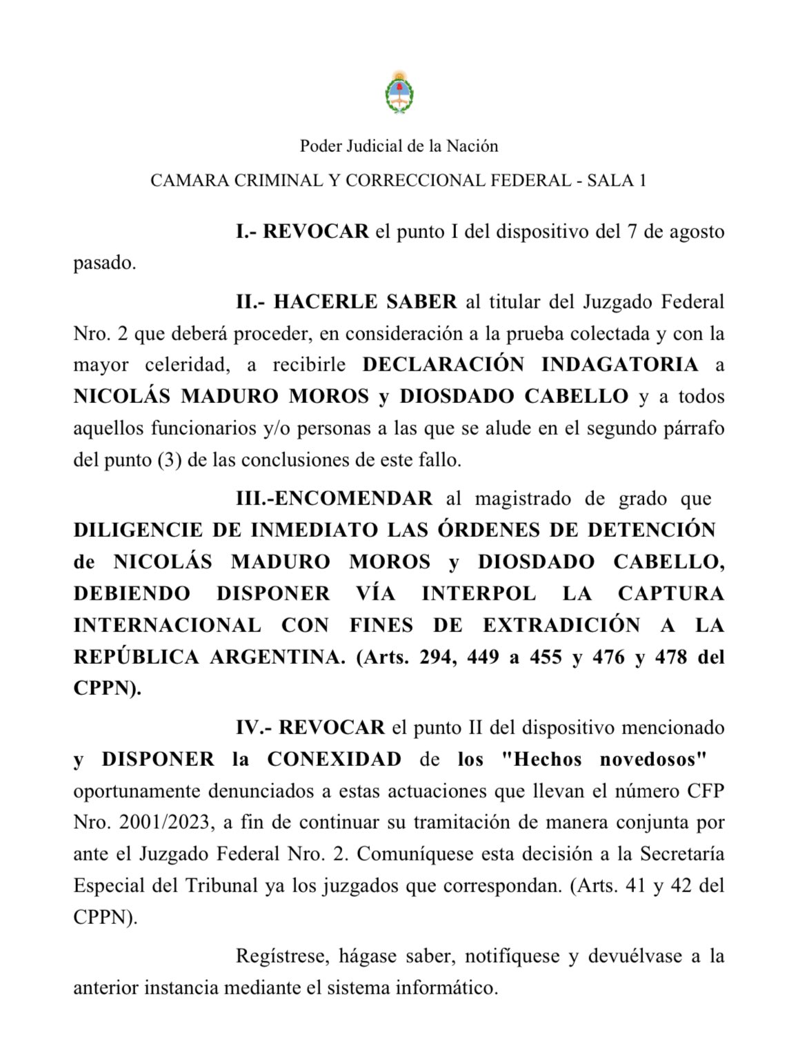 En una resolución considerada como histórica, la Cámara Federal de la Ciudad de Buenos Aires como resultado de una causa iniciada a principios de 2023 tras una denuncia contra Nicolás Maduro y Diosdado Cabello, presentada por el Foro Argentino para la Defensa de la Democracia (FADD), una acción jurídica legal respaldada por el principio de jurisdicción universal, que permite a los países intervenir tras delitos graves contra los derechos humanos más allá del país de dónde se hayan cometido- en este caso en Venezuela- el tribunal actuante ordenó las capturas a nivel internacional de Maduro, de Cabello y otros miembros del régimen, por crímenes de lesa humanidad.