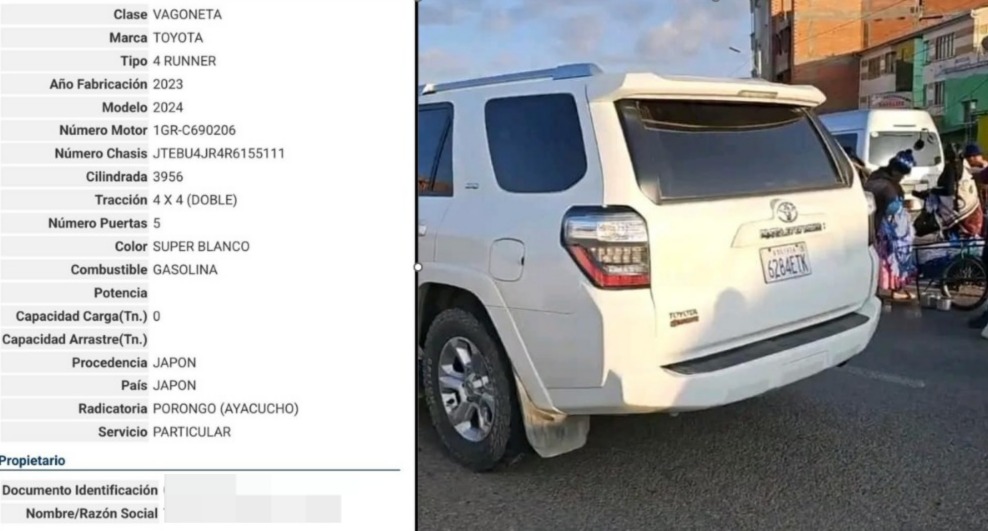 El dirigente cocalero Evo Morales estaría utilizando una vagoneta “de lujo” modelo Toyota 2024, valuada en $us 90.000, a nombre de T. J. N. Y., de 21 años, quien sería la hija de una mujer sentenciada por el delito de narcotráfico, denunció este jueves el ministro de Gobierno, Eduardo del Castillo.