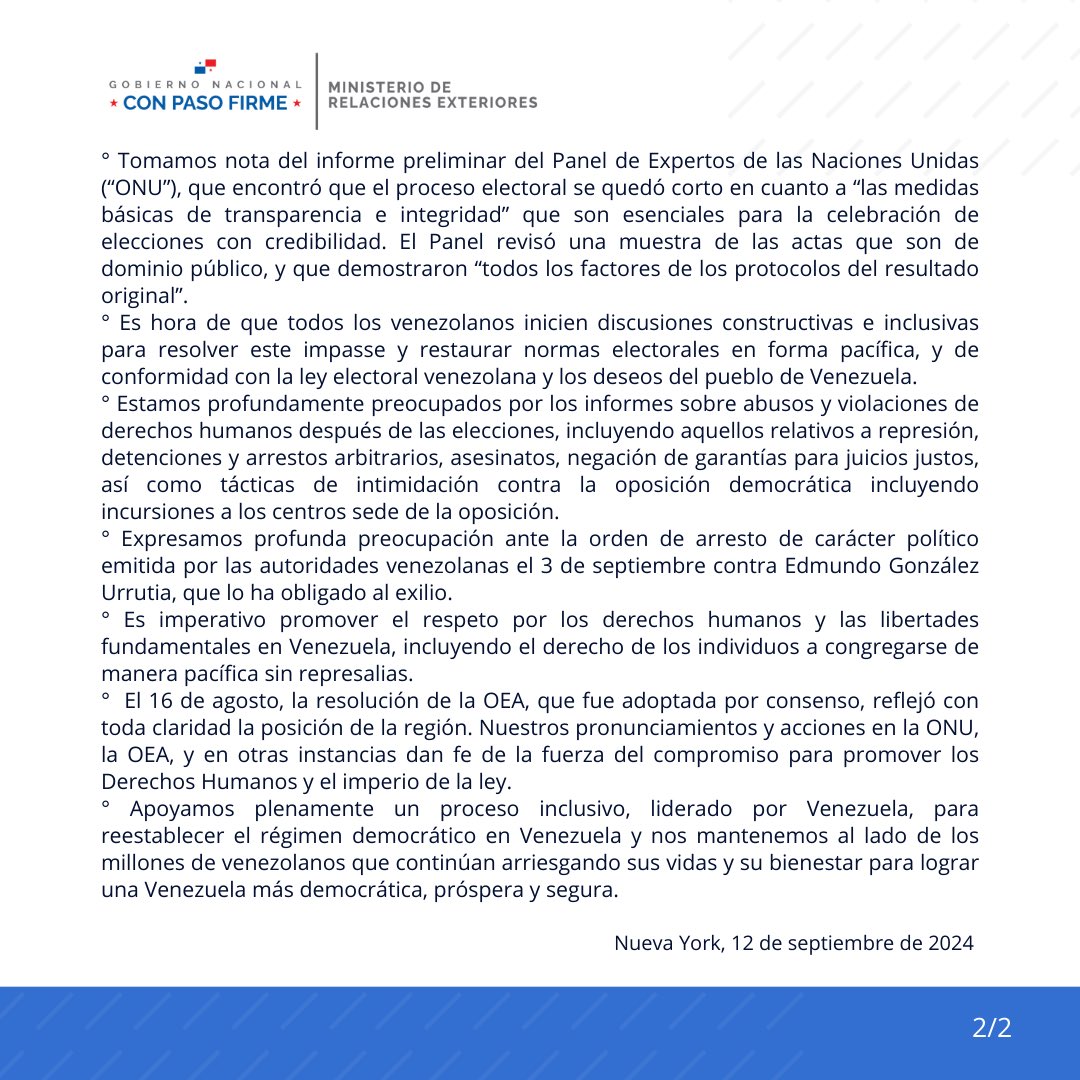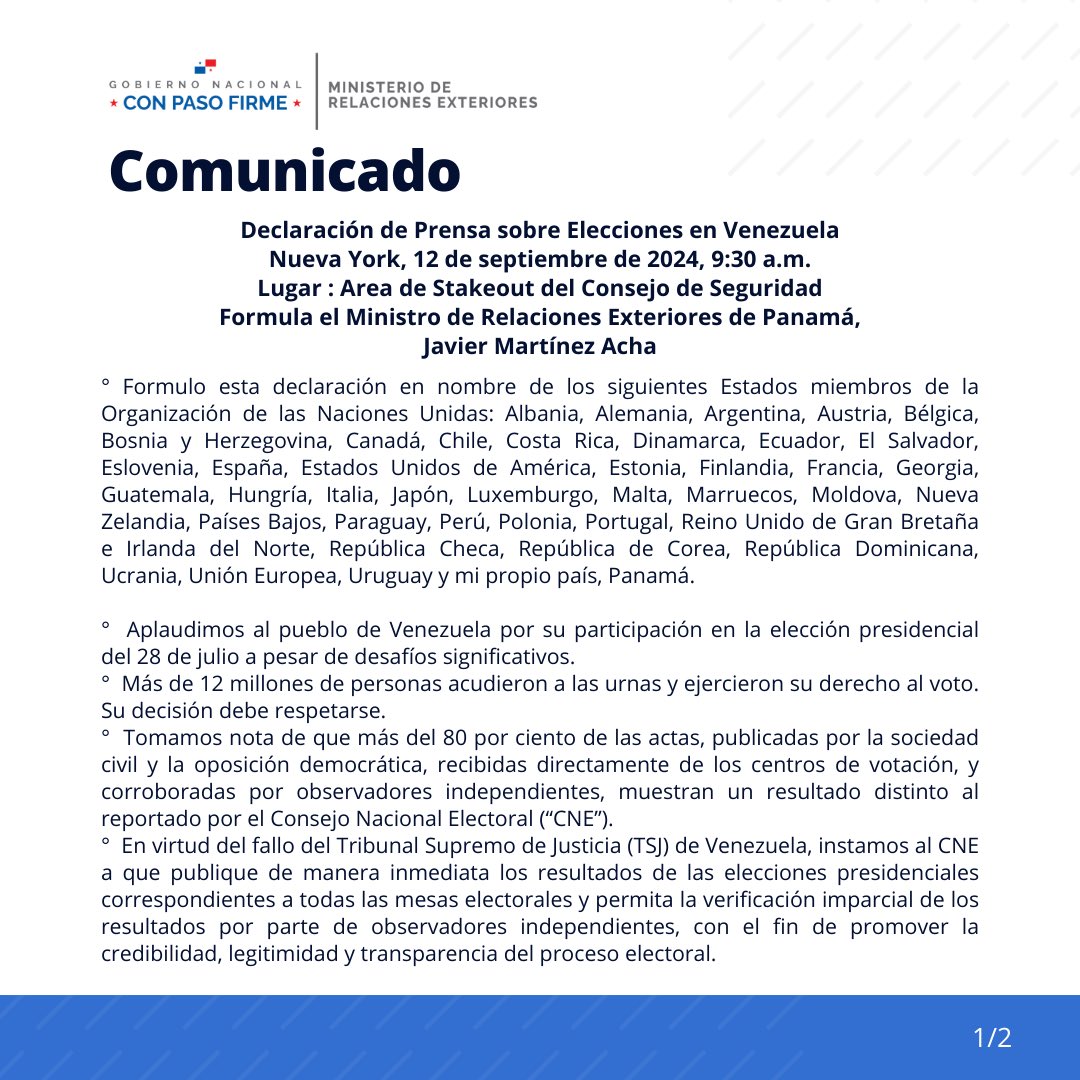 El canciller panameño, Javier Martínez-Acha, leyó la declaración donde no estuvieron las delegaciones de México, Colombia o Brasil, tradicionales compañeros de ruta de Maduro, aunque con críticas al régimen y tampoco la firmaron países como China o Rusia, ni ningún estado africano ni árabe, a excepción de Marruecos.